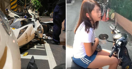 正妹騎車「被小強爬腿」 直接撞翻「整排警車」