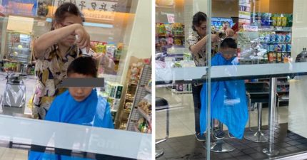 超商奇觀?大媽披圍巾自備工具「幫兒子剪髮」
