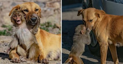 溫柔狗媽大愛「收養孤兒小猴子」 調皮猴囝仔各種吵都不生氣