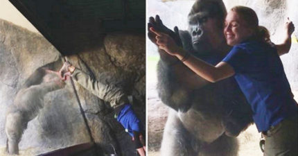 猩猩「神同步」飼養員每個動作 「隔著玻璃擁抱」太有愛