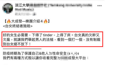 淡大社團成發宣傳「仇女言論」引戰 他:台女真的欠X!