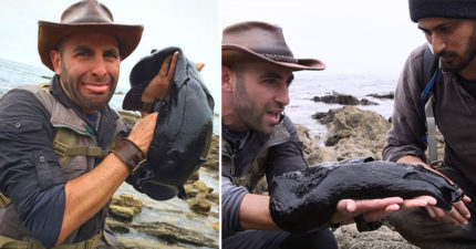 他在潮間帶挖到一隻「又濕又黏的黑色軟趴趴異形生物」,在手上蠕動的恐怖模樣會讓你吃不下飯!(影片)