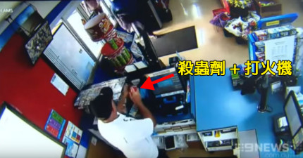 商店裡監視器拍到一起搶劫案,當店長把殺蟲劑和打火機拿出來對著搶匪後…