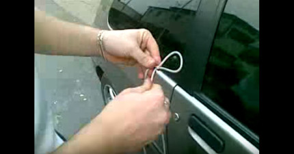 他被鎖在車子外面,接著他從口袋中拿出一個繩子,然後這樣綁一圈後…