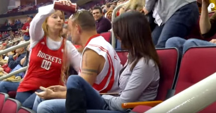 球賽親親鏡頭拍到他們,生氣女友將汽水倒在男友身上。右邊辣妹看不過去舉動讓全場爆炸!