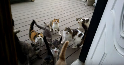 這人家門外每天都會聚集一整群超欠扁示威貓咪暴民,但只要他一把零食丟出去後…那畫面會秒融化你的心!
