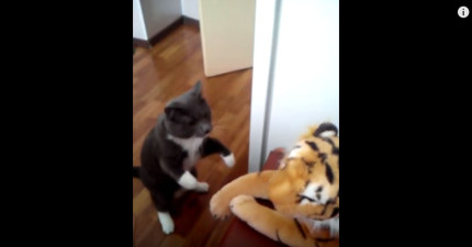 這隻貓咪超生氣自己長得沒有老虎長得這麼拉風,把所有氣出在玩具老虎的模樣會讓你嚇呆!