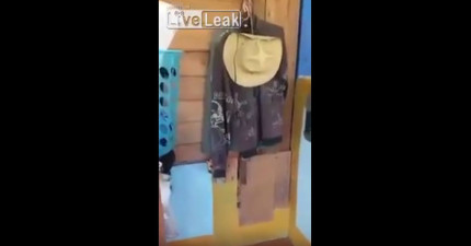 他早上起來發現到夾克自己在動還以為鬧鬼,當小心翼翼翻開時…嚇到立刻往後退3步!