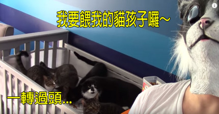 這個貓老爸以為戴著貓面具餵食貓孩子會讓他們感到更安心,結果180度超大落差讓我笑炸了!