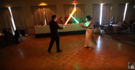 所有來賓都在等待新人跳第一支舞,結果他們居然拿出了光劍…