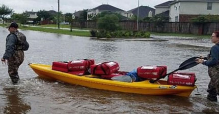 美國休斯頓遭受颶風哈維襲擊很多人挨餓,必勝客佛心組成「水上外送小組」搭獨木舟外送披薩!