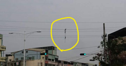 網友大老遠拍到電線上勾到東西,近看冷汗用噴的!網友:「都是為了生活,說起來都是淚」。