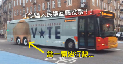 住在丹麥哥本哈根的網友拍到巴士上「請美國公民回國投票廣告」。巴士開始行駛「輪胎川普眼睛」網友狂讚笑噴!