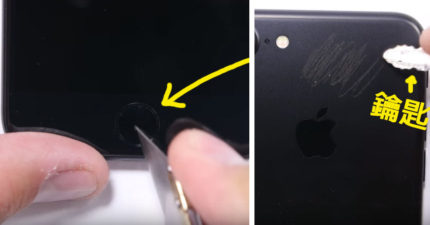 男子买了iPhone 7之后马上用不同尖锐度物品做「萤幕耐刮测试」,传说是水晶玻璃的Home按钮用刀片刮…