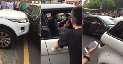 200萬名車擋著更貴的休旅車因此休旅車就把它狂撞,每撞一下民眾就歡呼,最扯的是還有人開始幫忙指揮!