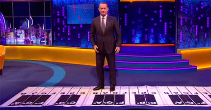 湯姆漢克斯站在大鋼琴前面準備要表演,從他背後出現的人讓觀眾都瘋狂了!