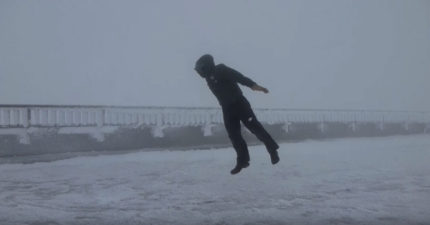 在山上神級強風風速高達175公里,男子不小心學會飛行技巧。