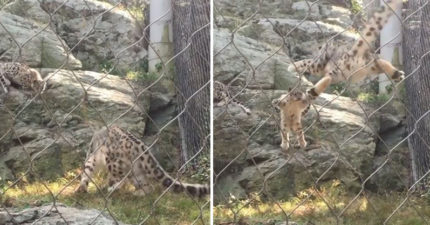 雪豹突然跳下想惡作劇媽媽!結果報應馬上來「神同步升空」:不愧是母子啊~
