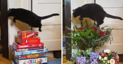 被胶带整过?黑猫「经过门口」就高空弹跳…连人都被当跳箱