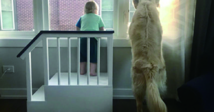 太矮看不到!爸爸訂製「看風景樓梯」讓寶寶跟大狗黏在一起❤
