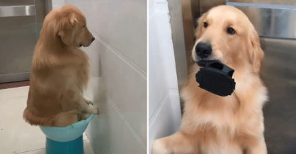 金毛塞臉盆面壁表情超無辜 畫面左移「超壯觀犯案現場」網笑噴:難怪被罰!