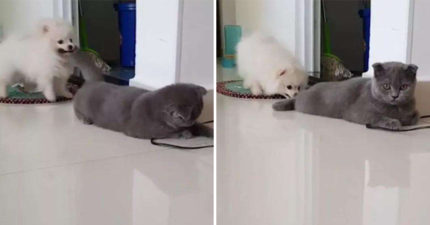貓咪被中二狗叼尾巴求玩 下秒露出「最厭世反應」表明心已死!