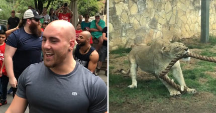 「2歲小母獅 VS. 3名摔角肌肉男」比拔河!10秒後壯男哭哭了