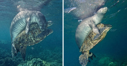 動物界超級英雄!發現海龜「被魚線纏住」,英勇海豹撲上去咬斷解困!