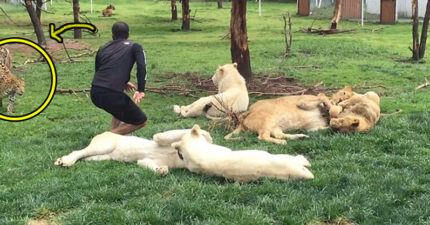 動物管理員跟「一群白獅子」玩耍 殊不知「後方老虎」已救他一命!