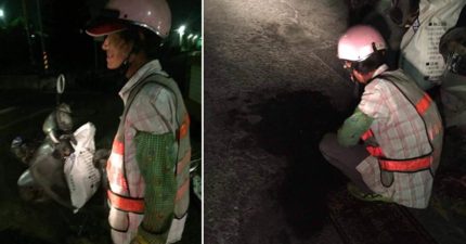 他常看到「這位老伯伯摸黑蹲在路邊」好奇上前詢問,老伯伯:「我怕別人跌倒…所以幫忙鋪坑洞」等政府太慢!