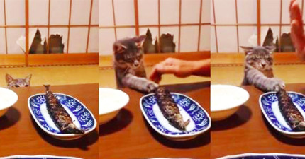 小貓拼命想摸燒魚不斷被主人阻止,結果最後竟然使出「絕地大反攻」讓主人笑到燒魚差點被攻陷!