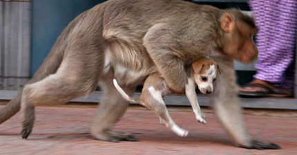 居民看到這隻「帶著狗狗的猴子」都嚇了一跳,但猴子接下來「野狗靠近時」的感人舉動已經讓人類上了最重要的一課!