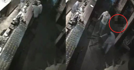 酒客在聊天時旁邊的椅子突然自己搖晃倒下,但最恐怖的是在兩個人身後拍到的…