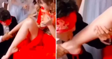 低俗鬧婚!新郎矇眼舔腿找新娘 「伴娘被舔尖叫」影片曝
