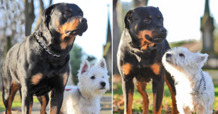 羅威那犬跟西高地白㹴「體型差兩倍」竟愛上對方,生下的黑捲毛小不點們萌得太超過了!(10張)