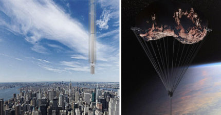 美建築公司設計「倒吊小行星上」懸空摩天樓 離開時只能靠降落傘!