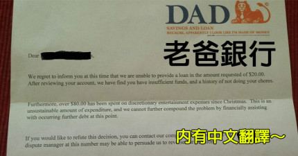 在6歲女兒跟老爸要670元的零用錢後,老爸竟然搞笑回了一封「老爸銀行正式書信」內容笑翻網友!