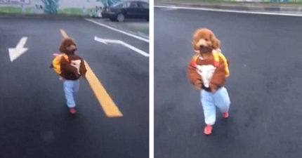 中國拍到這隻超萌紅貴賓「自己背小包包上學」。走路跟人類一模一樣萌翻路人!(影片)