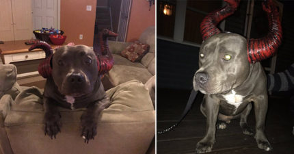 比特犬在萬聖節扮惡魔模樣迎接小孩「卻沒人敢摸他」,幾小時後拍下狗狗「可憐表情」讓全網路都哭泣了…
