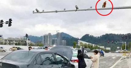 女驾驶看到红灯「紧急刹车」造成后车追撞,抬头一看才发现是个「猴子屁股」…