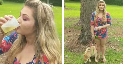 遛狗兼保養!她牽毛寶貝散步 接下「濃郁黃色精華」喝下:這抗粉刺啊