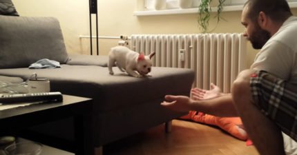 小法鬥站在生命分岔路猶豫 主人鼓勵「跳下狗生第一步」網友:勵志到噴淚!