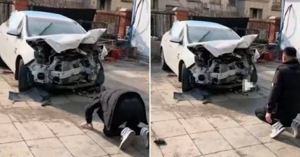 10年愛車撞爛報廢「人夫下跪對它磕頭道別」 妻含淚吐原因:應該的