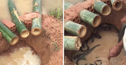 最神捕魚法!他在池邊放竹筒 隔天一打開就是滿滿的鰻魚+螃蟹!