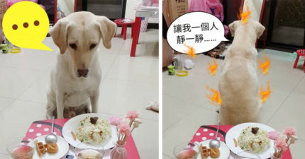 精心準備美味特餐,汪汪卻氣到「懷疑狗生」!往對面一看…主人你說你是不是故意的?