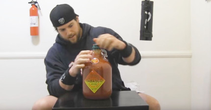 他決定挑戰「一口氣將3.7公升辣醬喝下去」,看到他最後的超崩潰反應我相信地獄真的存在了。