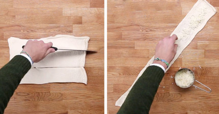 他將麵糰切成三份並且「在上頭灑上滿滿的起司」,完成終極美食後我決定馬上蹺班買材料回家做!