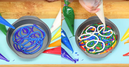 她將七彩蛋糕糊擠進鍋子時看起來根本一團糟,放進烤箱後的成品精彩到不行!