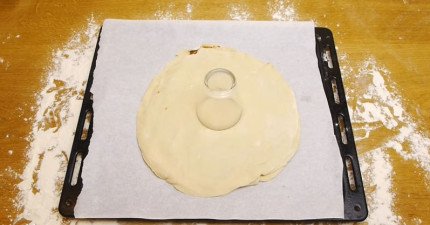 他桿完麵團後把一個杯子放到披薩皮上,看完後你就可以直接開高級點心店了!
