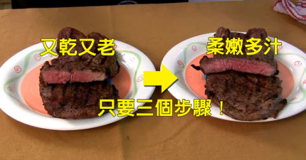 他在賣場買的最便宜牛排上鋪上一層鹽,步驟完成後就成功煎出入口即化的五星級多汁菲力!